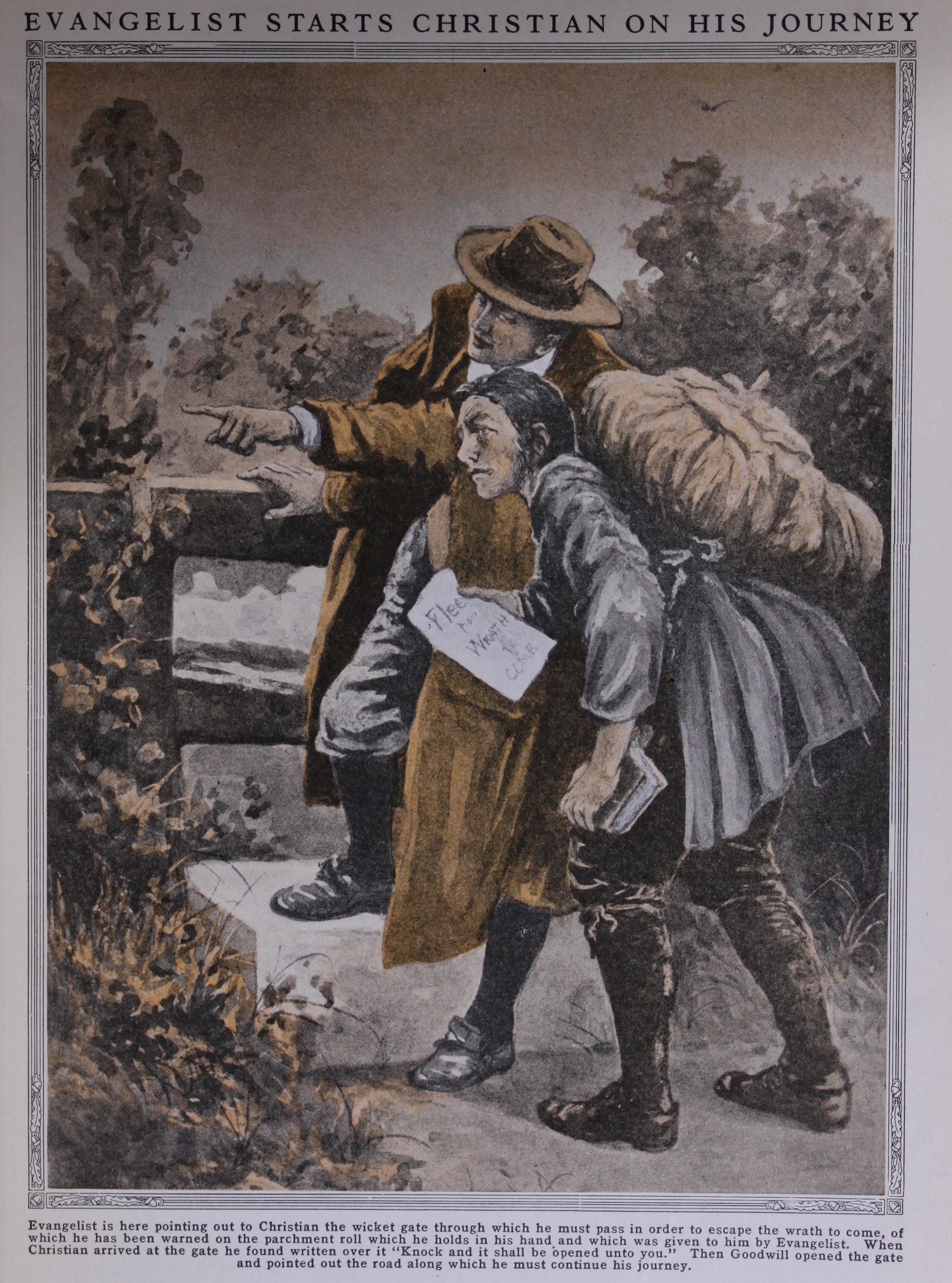 CHRISTIAN ROUTS APOLLYON "For half a day they fought. Apollyon struck his sword from his hand and pressed him almost to death, but Christian got his sword again and struck Apollyon such a blow that he spread his dragon's wings and flew away." wherein dwelt hobgoblins, satyrs, and dragons of the pit. But Christian drew his sword and went stead fastly on. At last he came safely through, and he thought he heard a voice going before him saving: " Though I walk through the Valley of the Shadow of Death, I will fear no evil; for thou art with me." Two Friends that Meet in the Dawn In the dawn he overtook Faithful who was on the same journey. Very glad of good company they went on together, and as they emerged from a great Wilder ness, Christian saw Evangelist again, behind them. He gave them much good counsel, but predicted that one of them should die a martyr's death.