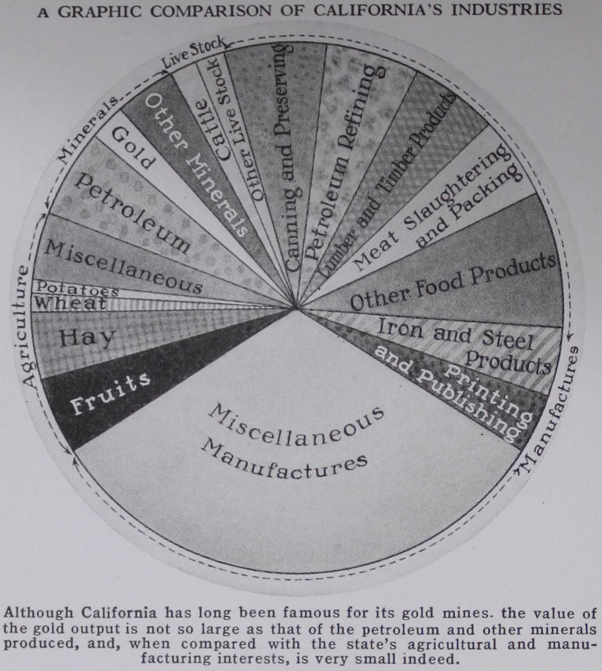 Most of the power comes, however, from the state's boundless deposits of petro leum. Thousands of oil wells, gation has made possible wide acres of fruit groves, olive groves, berry ranches, nut groves, and other endlessly varied crops. Former deserts, like the Imperial Valley, are amazingly fertile under irrigation. Here also are a number of large ostrich farms, and many apiaries where the bees, buzzing over the orchard blossoms, accumulate tons upon tons of honey. The world's leading center of the motion picture industry is at Los Angeles, brought thither by the perfect weather conditions, and the fact that scenery of every type is within easy reach of the scores of studios. Whether the scene of the play be tropical Africa or India, arctic Alaska or Switzerland, mountainous South America, or the barren deserts of many of them put down from piers into the bed of the ocean, produce the heavy oil fuel which is burned in nearly all the California locomotives and in the greater proportion of the factories. California owes its recent rise to a position among the ten leading manufacturing states to the discovery of these petro leum resources and to the harnessing of the streams, for it has little coal.