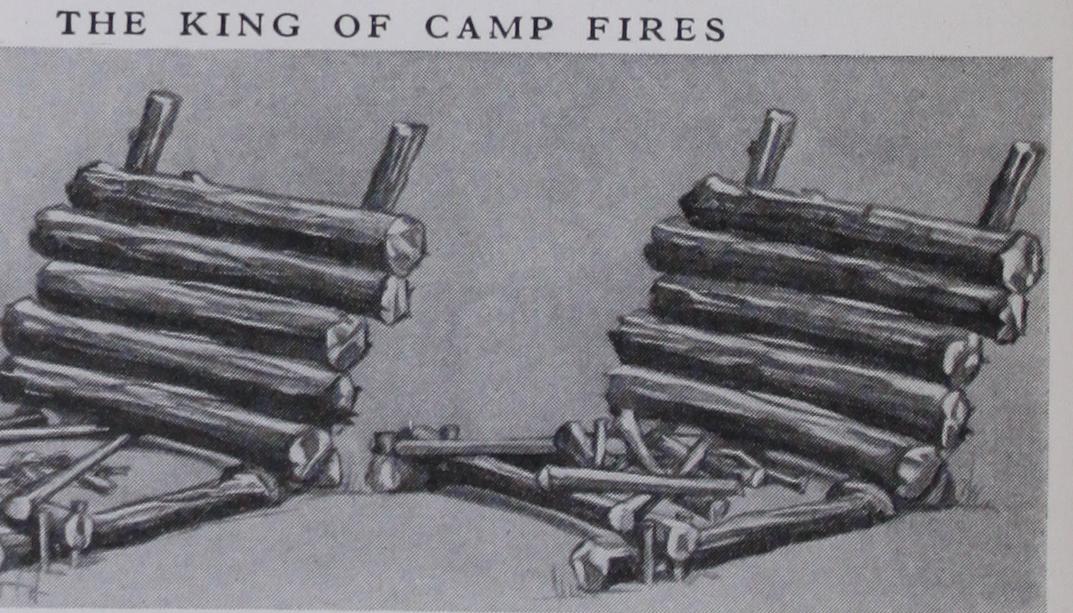 The king of camp fires is the backlog fire. Cut two 2-inch stakes of some green hard wood about four feet long, and drive them into the ground about two feet apart, leaning away from the front of the tent and eight to ten feet distant. Against these pile five logs, three feet long and four or five inches in diameter.