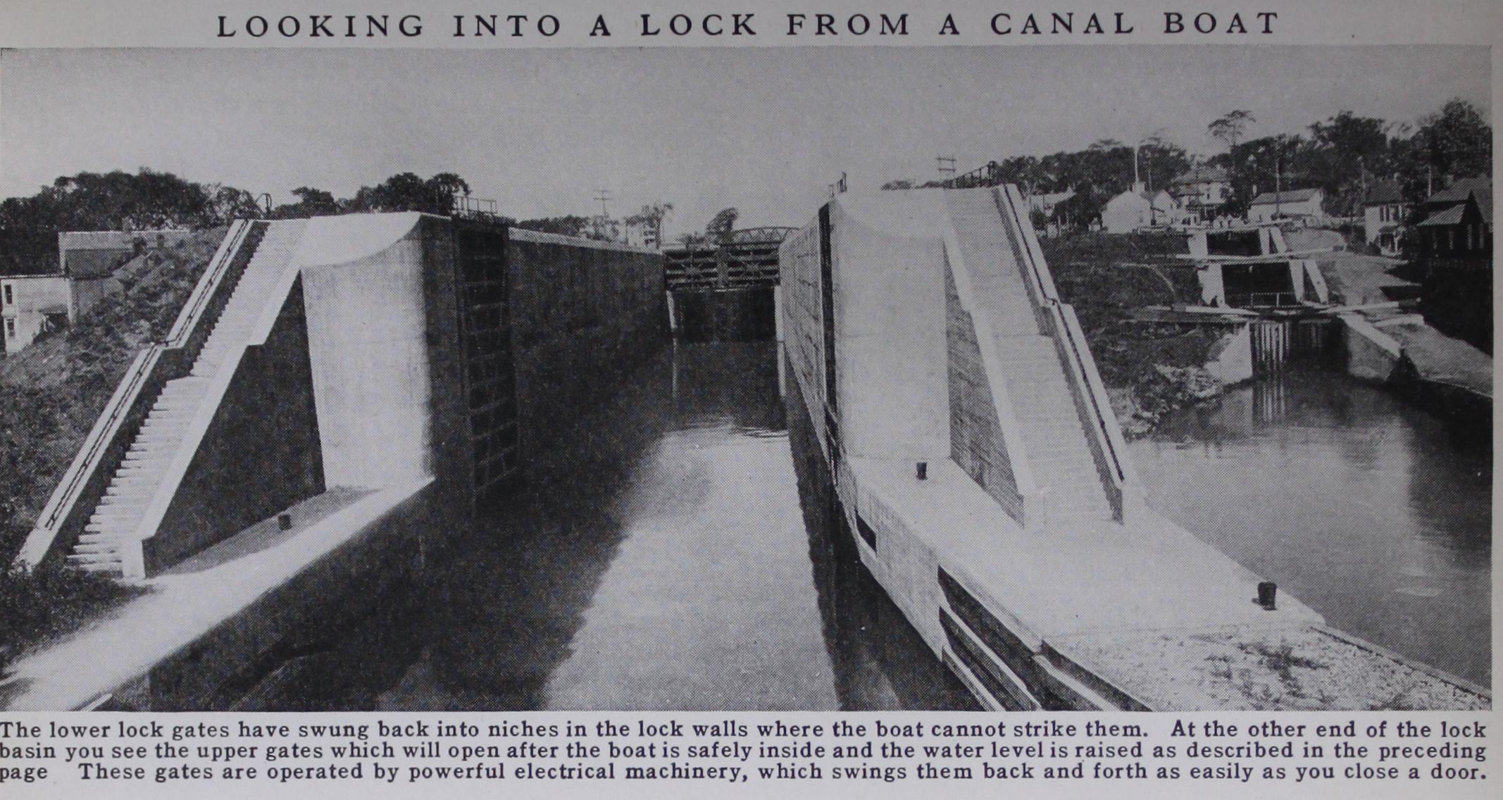 The second half of the 18th century saw great activity in canal-building in Great Britain, to trans port coal and other bulky commodities, and this con tinued unabated until the introduction of railways, 75 years later. The Manchester Ship Canal, between Manchester and Liverpool, is a noted example of how Until the invention of the canal lock in the 14th or 15th century, canals could be built only where the country was level. A lock is a device for raising or lowering a boat from one water level to waterways may be constructed to join an inland city with the coast. This canal, the most important in the British Isles, makes the great manufacturing city of Manchester a seaport, though it is 35 miles from the coast. There are four sets of locks, each set consisting of a small and a large lock side by side. Probably the most interesting feature of this work is a swing bridge, which carries the old Bridgewater Canal (1759) over the new Manchester waterway. This is a great steel trough 19 feet wide, 6 feet deep, and 234 feet long, which may be closed off from the rest of the overhead canal and swung about an axis, so that boats may pass by in the lower canal.