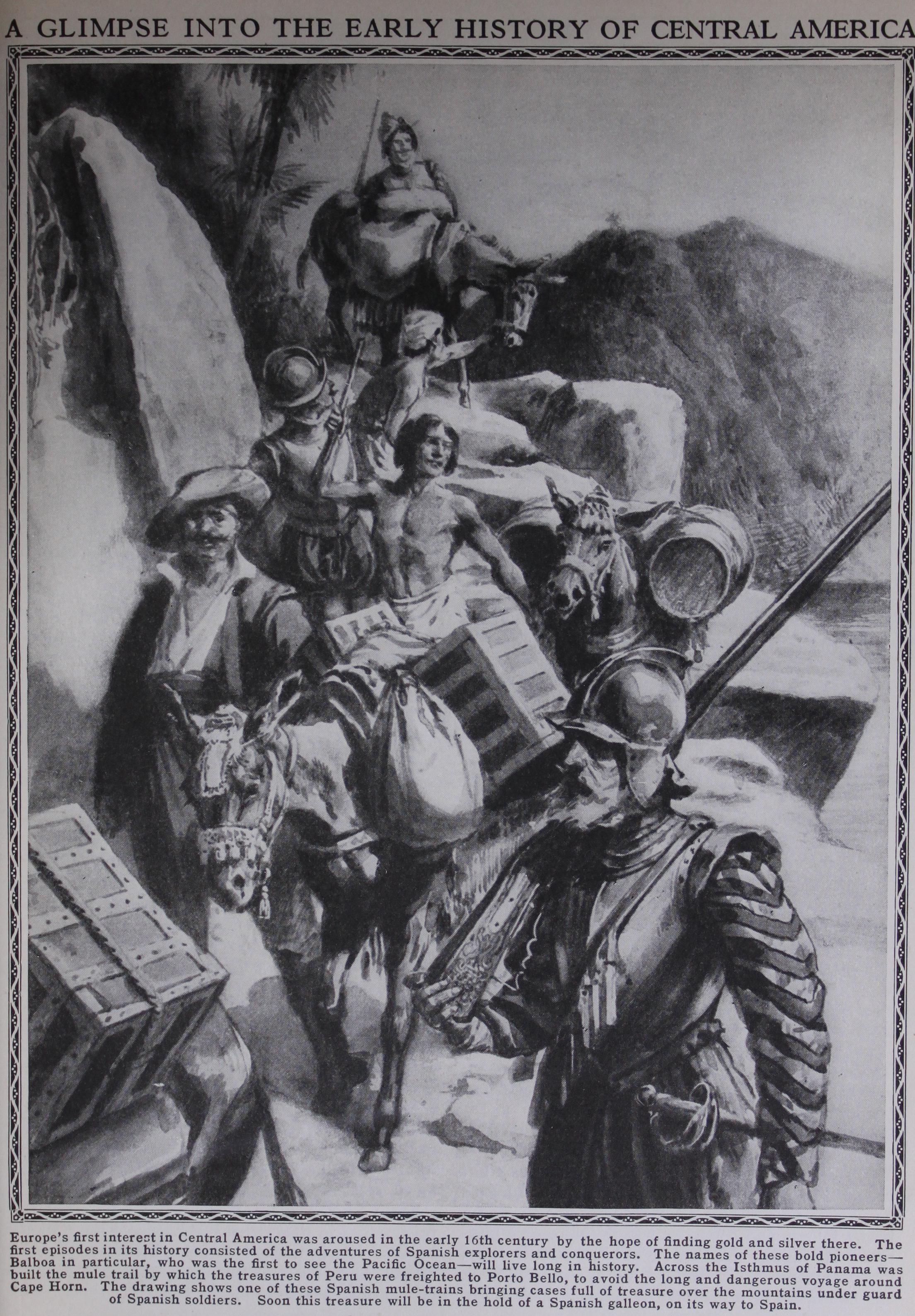 Central America was discovered by Columbus in 1502. Costa Rica was conquered by the Spaniards after 1513, and the rest of the country was subjugated between 1522 and 1525 by Hernando Cortez after his conquest of Mexico. Great Britain colonized British Honduras in the 18th century and exercised a protectorate over the Mosquito coast until 1860. The rest of Central America remained a Spanish dependency bearing the name Guatemala (with the exception of Panama, which belonged to New Granada) until the revolution of 1821, which established the present independent republics, with governments similar in form to that of the United States. Area, about 213,000 square miles; population, about 5,500,000.