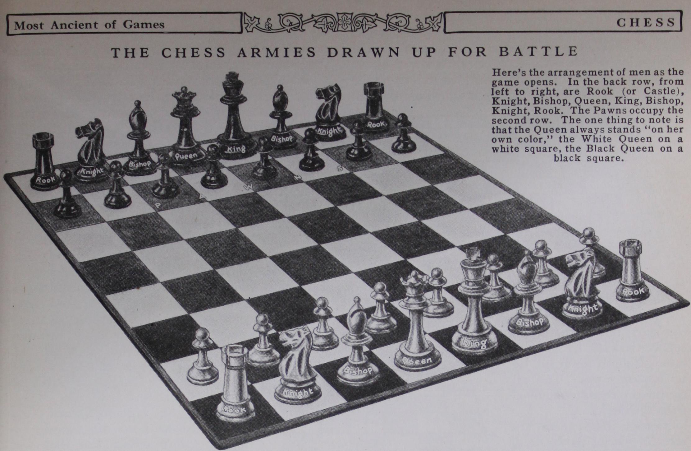 Today the bay, which divides the state of Maryland in two and separates also one part of Virginia from the rest, is busy with a great traffic. Ocean liners and big cargo steamers mingle with the host of smaller craft. The latter are either oystermen, or carry on a brisk trade in vegetables and watermelons Chess is probably the most ancient of all games of pure skill. Its origin is lost in the legends and traditions of the past. It was undoubtedly invented somewhere in the Far East, passing from India to Persia, and thence to Europe. The word " chess" is supposed to be derived from " Shah," the Persian word for king, and " checkmate" from "shah mat," meaning "the king is dead." The chessboard is the same as the ordinary checker board. It is divided into 64 alternating black and white (or red) squares, and the board is so placed that each player sits with a white (or red) square at his right hand. In setting up the pieces always The moves of the Bishop are diagonal, but if there's nothing in the way he can go as far as he pleases. His method of travel, as you can see, keeps him always on squares of the same color.
