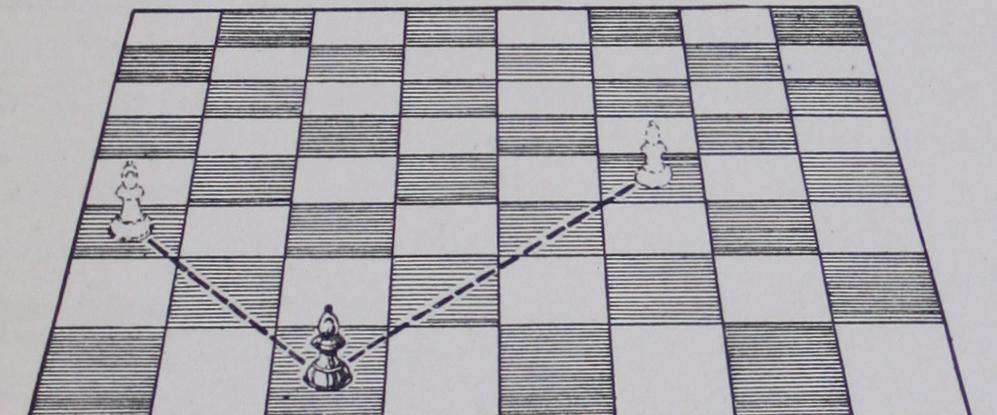 A very simple game, called the "scholar's mate" or "fool's mate," is given here: This game, though won by White by methods that could easily be defeated, illustrates several of the moves of chess. A pawn moves one square ahead, except on the first move when it may be advanced two squares. Pawns cannot move backwards. In making a capture, however, the pawn moves diago nally and occupies the square of the captured man.