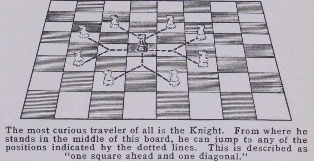 A bishop moves diagonally in any direction and for any distance so long as it keeps to the square of its own color. The knight moves one square vertically or horizontally and one square diagonally. The knight has a special privilege not accorded to the other pieces; it can accomplish its move by jumping over any men that happen to be in the way, provided the move can be completed on a vacant square, or on one occupied by an opposing man, in which case the knight captures it. Unlike checkers, however, " jumping" does not involve the capture of the intervening pieces. The rook or castle moves either vertically or horizontally any distance so long as the path is open. The queen is the most valuable of all front of the king as a protection, he is " checkmated." The king is never actually captured, and is never per mitted himself to move into check. A "stalemate" occurs when one player or the other, though not in check, cannot move any of his pieces; more specifi cally, when one side cannot move without bringing his king into check. This is a draw. A game is also a draw when neither player has sufficient men left on• the board to checkmate the other, as, for instance, when a king and one bishop are left against a king, or a king and one or two knights against a king.