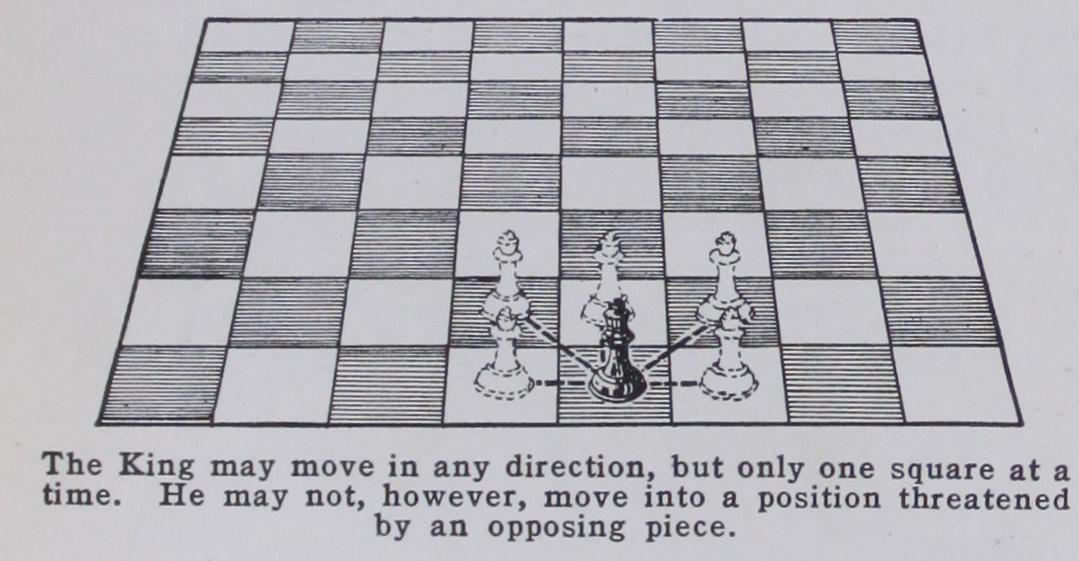 If we accept one tradition, it was invented in India to divert men from the attractions of actual war. In chess two opposing forces—consisting on each side of the king and queen, two bishops, two knights, two rooks (or castles), and eight pawns (foot soldiers), are drawn up in battle array, and the strategy of the conflict lies in making a successful attack on the enemy's king. When one player or the other is unable to protect his king from capture on the next move he is " checkmated," and the game is over.