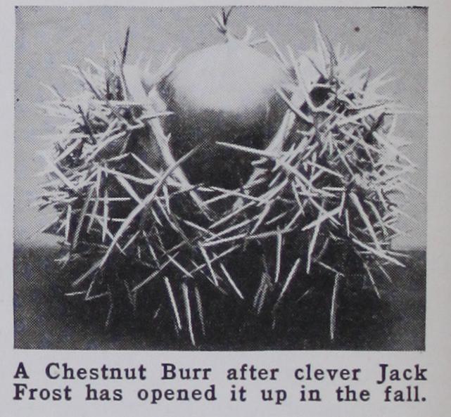 Scientific name of the American chestnut, Castanea dentata. Bark gran ite-gray, ridged in older trees. Leaves simple, alternate, oblong-lanceolate, feather veined. Fruit maturing in green prickly husks which open in four sec tions, disclosing three or four oval nuts.