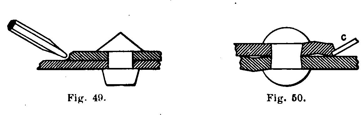 The calking tool is similar to a chisel, the end having a variety of shapes. Fig. 49 shows a round-nosed tool which burrs down the upper plate without cutting the under plate ; but it is hard to start, and in calking with such a tool the edge is first started with a sharper round-nosed tool, and then finished with one as indicated in the figure. If a square-end tool is used, as shown in Fig. 50, the under plate is likely to be cut, and the plates between the edge and the rivet be separated. The most common form of calking tool is one similar to the one shown in Fig. 49, except that the end is flat, with a slight bevel, and not round.