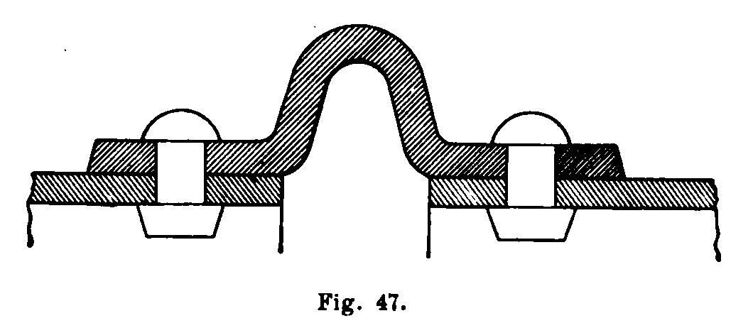 FURNACE FLUES FOR CONSTRUCTION OF BOILERS Flues which are subjected to external pressure should always be cylindrical. Fig. 45 shows the section of the Adamson flue. This was an improvement over the plain furnace, as it is more elastic and allows expansion ; the flanged rings also strengthen and stiffen it against collapse. The methods of building furnaces shown in Figs. 46 and 47 are not considered as good as the Adamson arrangement. Fig. 46 is too rigid, and does not allow a free expansion and contraction. Fig. 47, on the other hand, permits of such extremely well, but both have the fault of exposing a double thickness of plates and two rows of rivets to the fire.