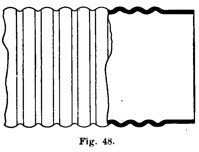 The corrugated flue shown in Fig. 48 is popular and, furthermore, is excellent. There is freedom for expansion throughout its whole length, thereby reducing the strains on the boiler.