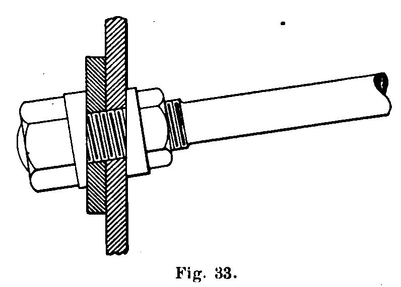 A form of diagonal stay is shown in Fig. 31. The plain rod is connected to angle irons by means of split pins. The angle irons are fastened to the shell and end by rivets or bolts. Another form of diagonal stay, called the crowfoot, is shown in Fig. 32. The two ends are bolted or riveted to the end and shell.