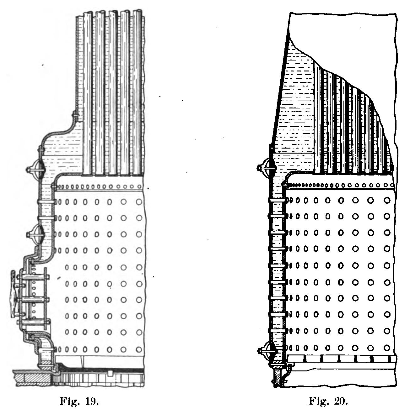 The external fire box is joined to the shell by a double flanged ring as shown in Fig. 19; or, by the cone-shaped section as illustrated in Fig. 20. The top edge of the internal fire box is riveted to the lower tube sheet which is flanged. The bottom of the inner fire box is connected to the outer shell by a welded ring (shown in section in Figs. 19 and 20) called the foundation ring. The water space between the inner and outer fire box plates, called the water leg, should be large.