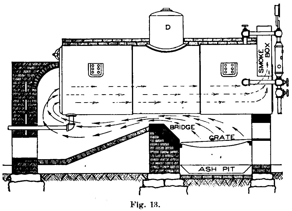 The brick setting consists of brick laid in cement or mortar. The bridge and the portions of the furnace exposed to the fire are lined with firebrick. The bridge is built at the rear of the grate and forms a support for the grate bars; it also directs the flames upward. Thearrows show the direction of the flow of hot gases. The furnace is formed by the bridge, the side walls, and the lower part of the boiler front. The • boiler front is usually of cast iron with the lower part lined with fire brick. The front has doors which lead to the furnace,-ashpit, and smoke box. The space below the grate is called the ashpit, and through its doors ashes are removed and a large portion of the air for combustion enters. Both the fire doors and ashpit doors have draft plates, or grids, to regulate the supply of air. The doors to the smoke box give access to the tubes for cleaning and repairs.