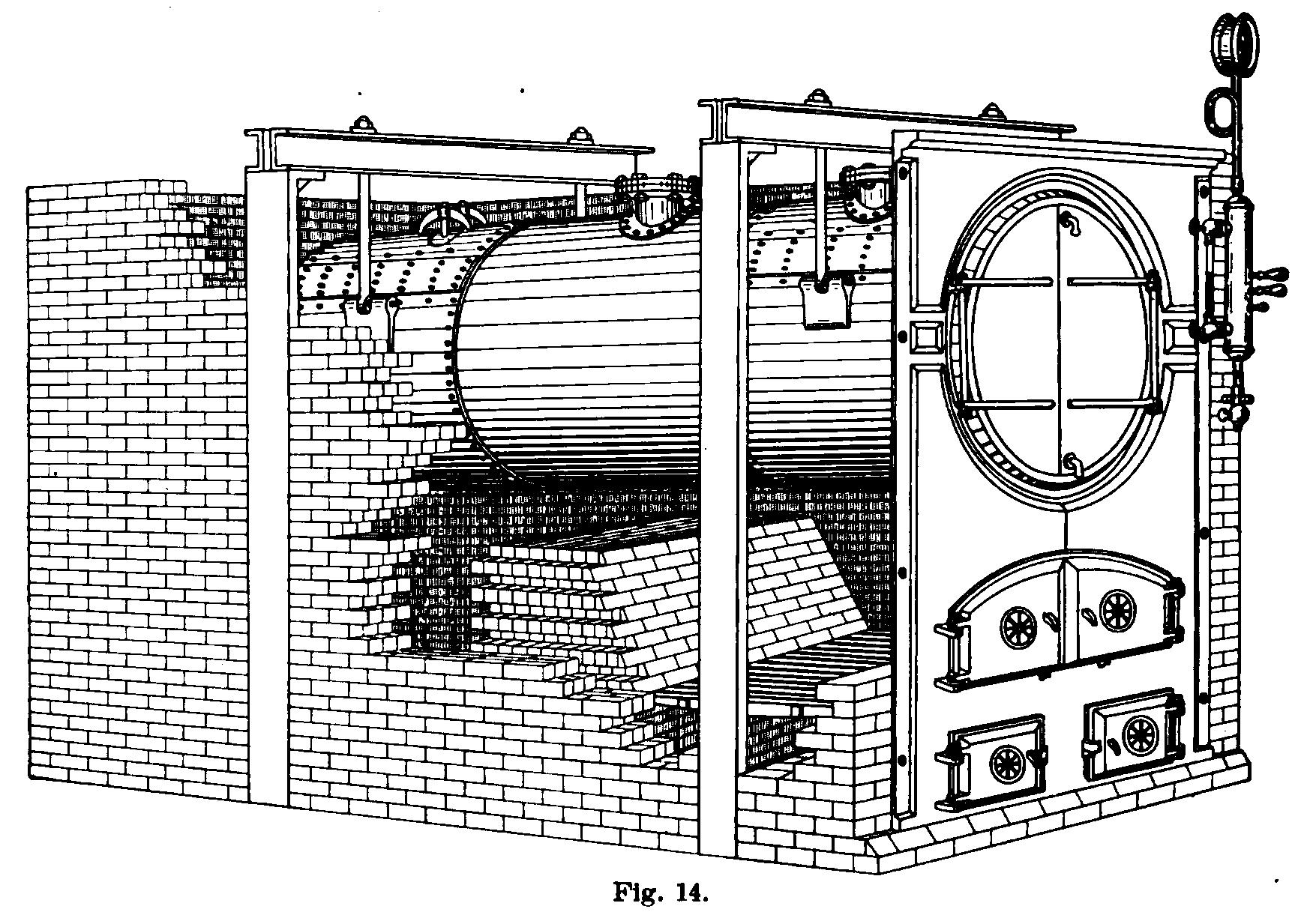 The complete multitubular boiler is shown in its brick setting in Fig. 14, and a longitudinal section of the setting in Fig. 13.