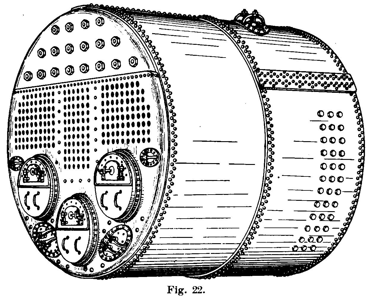 As the return-tube boiler has several flat surfaces, this type requires careful staying. The flat ends above the water level are prevented from bulging by long stay rods which are similar to those in the multitubular type. Below the water level, the furnace flue and the tubes aid in holding the flat plates together. In addition, a few of the tubes (shown by the heavier circles in Fig. 21) are made thicker so that a thread may be cut on the ends which are screwed into the tube sheets and held by thin nuts. The combustion chamber plates are stayed to the rear end plate and the shell by short screw stay bolts. The flat top of the combustion chamber is supported by girders or crown bars.