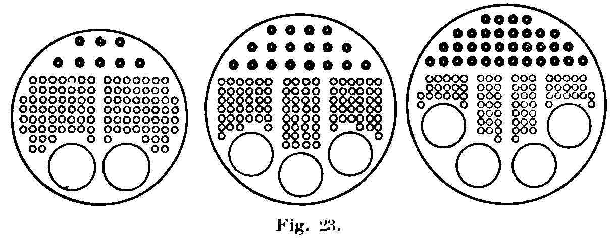 Fig. 22 shows a boiler with three furnaces. Large furnaces are more efficient than small ones because the grate area increases directly as the diameter, while the air space above the grate increases as the square of the diameter. The greater space aids combustion. The length of the grate bars is nearly constant for all sizes of flue because it is limited by the distance a fireman can throw coal. Furnace flues are usually from 36 to 54 inches in diameter. As the size of furnaces is fixed, the number depends upon the size of the boiler, for a large boiler must have a large grate area which can be obtained only by using several furnaces. The various arrangements are shown diagrammatically in Fig. 23.
