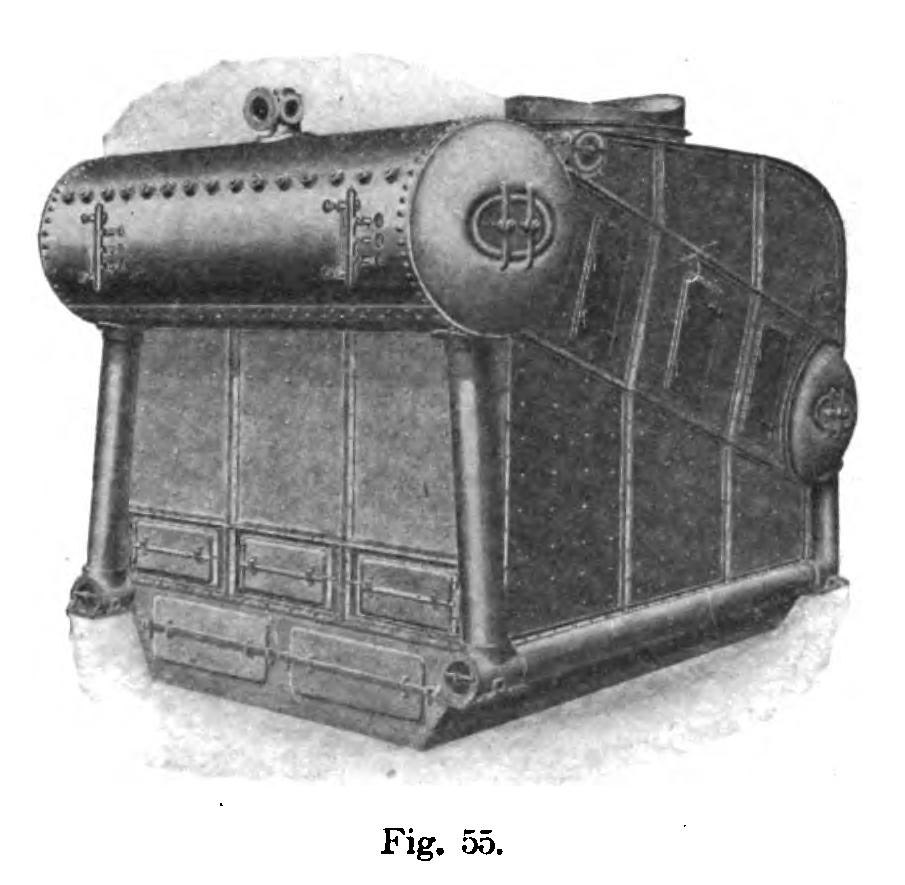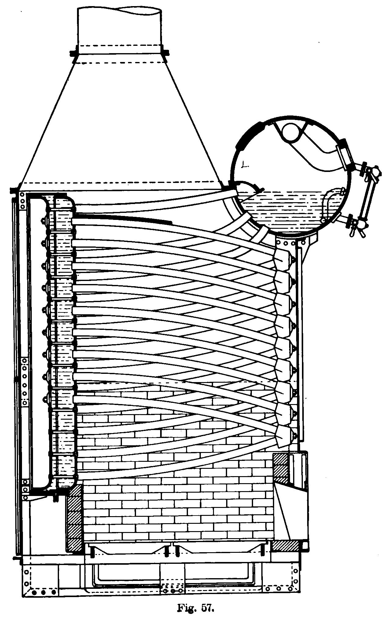 and along the pipe at the bottom (see Fig. 55), up to the water drum and from thence to the steam drum by the tubes which are in contact with the hot gases.