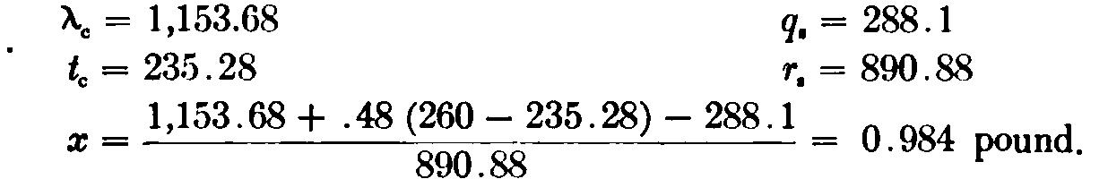 Example. Barometric pressure, 14.78 lbs. Absolute pressure in main steam pipe, 87.78 lbs. Absolute pressure in calorimeter, 23.03 lbs. Temperature (T) = 260° F. Then, Or, in other words, 98..4 per cent of the mixture is steam; or the moisture = 1 — 0.984 = 0.016, or 1.6 per cent.