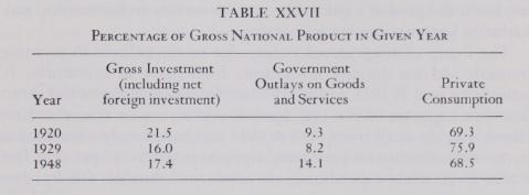 In order to make significant comparisons with the booms culminating in 1920 and in 1929, it will be useful to compare the relative importance of these components in the gross national product for each of the three years 1920, 1929, and 1948. These data are presented in Table XXVII.