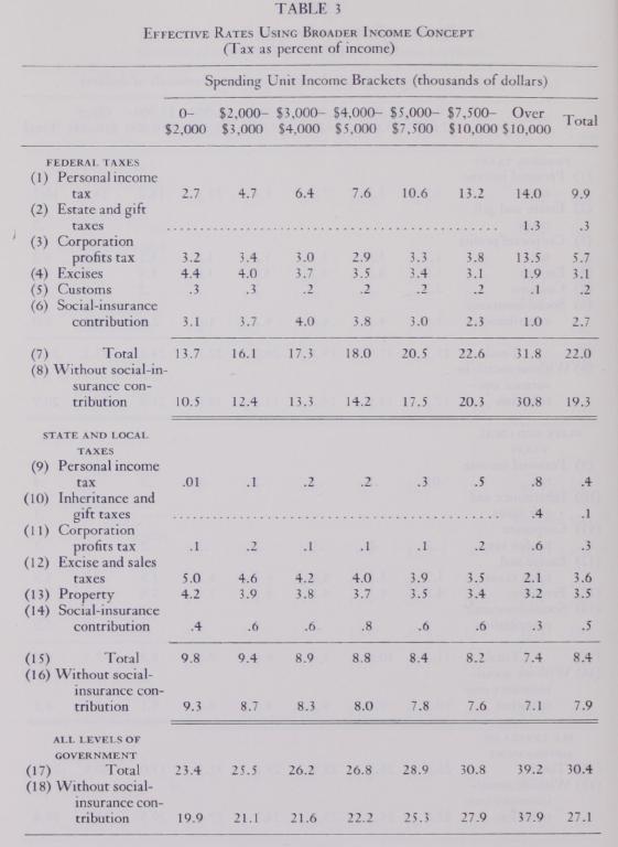 The general picture may be qualified in two ways. For one thing some people feel that social insurance contributions (all or in part) ought not to be counted since they go to purchase special benefits which are not included in the picture. While I don't quite subscribe to this view, those who do will find the overall picture excluding social-security taxes in lines (8), (16), and (18). As shown in line (8) this makes for a more progressive picture, especially at the lower end of the scale.