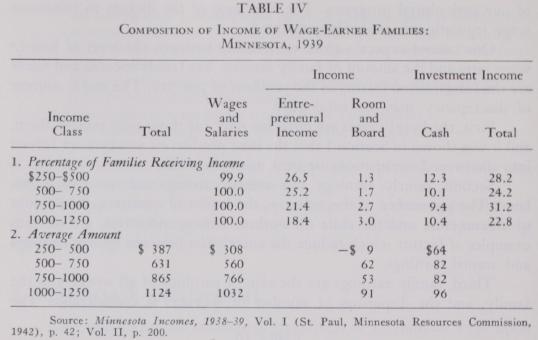 Fourth, although wages are, of course, the chief component of the income of low-wage families, they are by no means the only component. It is indicated in Table IV that a tenth of the wage-earner families had cash investment income, a quarter had entrepreneural income, and a quarter owned their homes.