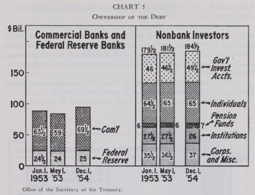 Now, the first job with the volume of money rising, and with an inflationary situation in the early months of 1953, was to see that our debt operations did not add to the volume of bank credit, that is, that our securities were sold as largely as possible outside the banks; and chart 5 shows that from January 1 to May 1, 1953, bank holdings of governments showed a decline rather than an increase. The Federal Reserve holdings also were down a little.