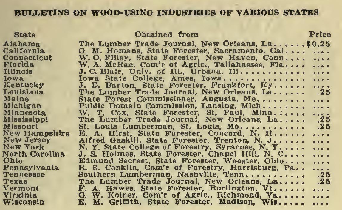 INDUSTRY REPORTS The reports of the United States Forest Service upon the wood-using industries of 24 States are now available, some of the reports being already out of print. Since these reports are mainly of local value, they have been printed by some department of the government of the particular State interested, or by an association or periodical devoted to the interests of lumbering or conservation. The bulletins listed below may be secured in each case from the address given. In writing for those for which there is no charge, postage should accompany the request.