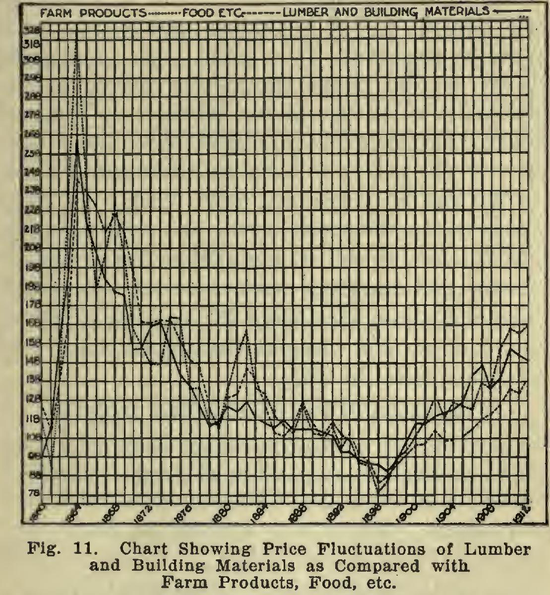 The statement that lumber has reached such an exorbitant price that it can no longer be'used, is best met by the records of the United States Bureau of Labor, the authority on the wholesale prices of all commodities. On page 149 of Bulletin 114 of the Bureau is given a table of the relative prices of nine groups of commodities from 1860 to 1912, the average price from 1890 to 1899 being taken as 100. The chart (Fig. 11) shows in graphic form the record of the Bureau for three of the most important groups of commodities—farm products, food, and lumber and building materials. On the t, farm products are indicated by a dotted line, food by a line of dashes, and lumber and building materials by a solid line. A single glance at the chart completely answers the statement as to the undue advance in lumber prices. On an average, these prices have run between the prices of farm products and of food for the last 50 years, and with neither as high points nor as low points as the two other groups. Still further, it will be noted that the prices of lumber and building materials are relatively lower now than they were 40 years ago; yet at that time no one thought that lumber was too expensive to build with.