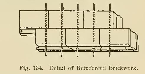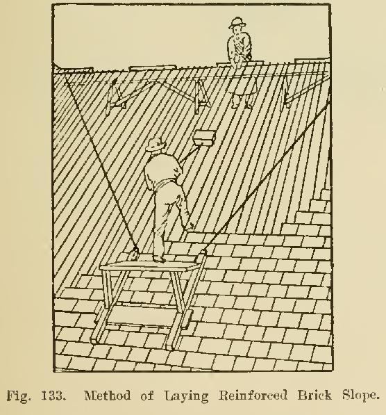 Reinforced Brickwork. The pioneer of reinforced brickwork was Cottancin, a French engineer. More recently the claims of reinforced brickwork have been advocated by two or three specialist firms, and used with 'considerable advantage in the construction of walls and floors in industrial and other buildTugs. The latest application of the same prin. ciple is exemplified by various river and canal banks in France, which are faced with reinforced brickwork, as illustrated in Figs. 133 and 134. The bricks are pierced by two holes for galvanized or copper wires, and are set as follows: The slope to be protected is finished to the required gradient, and the reinforcing wires are secured to a cable stretched along the bottom of the slope. The free end of each wire is then attached to a horizontal frame at the top of the slope, where the bricks are threaded on the wires and slid down to the bricklayers. When the work has passed beyond reach from ground level, the layers stand upon a small platform, as shown in Fig. 133; and, on completion of the facing, the upper ends of the wires are securely anchored.