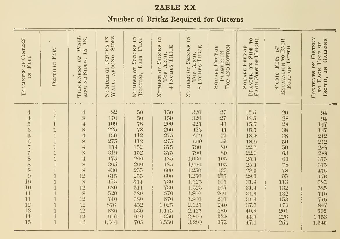 To use Table XX, multiply the number of bricks in column corresponding to the diameter and thickness of wall desired, by the depth of the cistern; and add the number required for the top and bottom. The top should have a rise of about one-fifth the diameter.