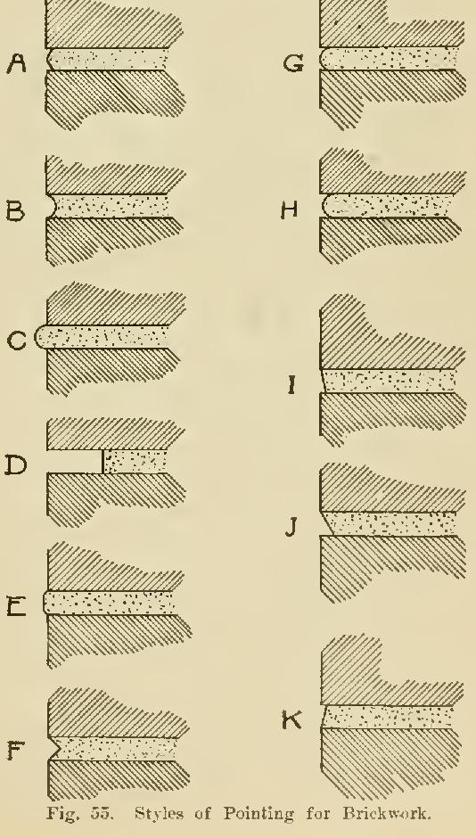 The joint shown at C is much used in pressed-brick work; and that at D is its obverse. These and the other special joints are made with special jointing tools of the desired shape. with the exception of that shown at E. To make this, an iron rod is used the thickness of the joint. This is laid on the face edge of the 'brick already placed, and the mortar is spread out to it. When the mortar has set enough, the rod is removed. Several rods are required.
