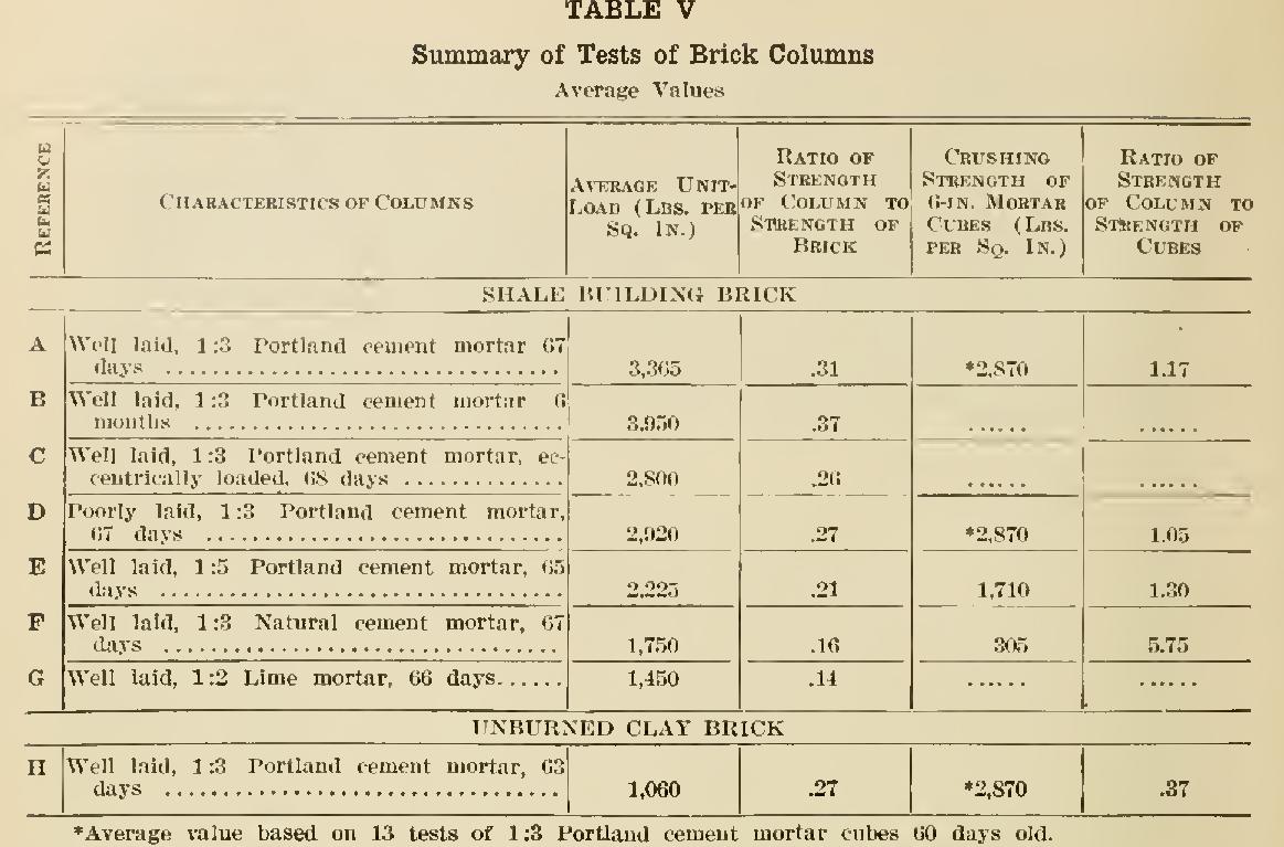 Table V gives results of some recent tests of brick columns made of brick similar to those referred to in Tables III and IV. The columns were inches square, and were from 40 to 43 courses of brick high. The letters at the left refer to groups of several tests. Group H is of under-burned clay brick. The load in C was applied one inch from the center.