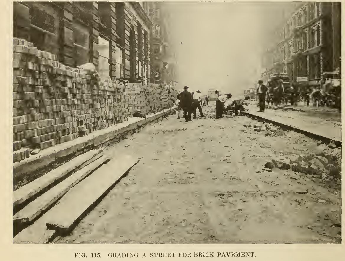 The general method of laying brick pavements is illustrated in Fig. 117. • The cost of a brick pavement with pitched joints such as shown in Fig. 117 is about $2.60 per square yard; while the cost of the curbing as shown, is about 45 cents per linear foot.