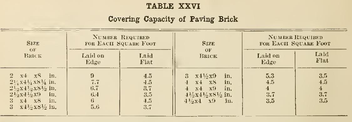 Brick, 4 inches of brick on 3 inches of sand, 65 to 85 cents per square yard; 4 inches of brick on 6 inches of natural cement concrete and 11/2-inch cushion of sand, $1.20 to $1.60 per square yard: sidewalks, 2 inches of brick on sand, 50 to 80 cents per square yard. Tables XXVII and XXVIII may he used in computing the number of bricks required for the foundation and top courses respectively of pavements.