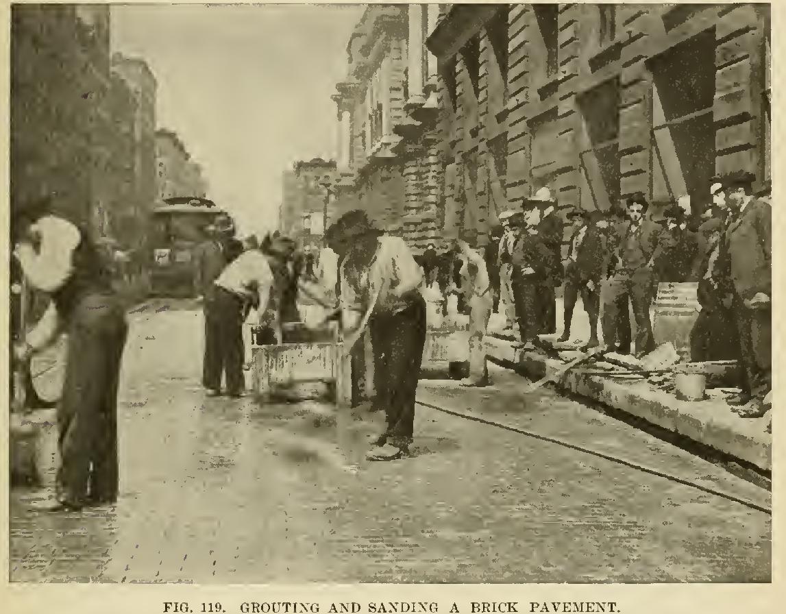 The following analysis of the cost of brick paving is taken from "Engineering News." July 24, 1902: "The following is a summary of {he cost of paving with brick laid on edge, wages being 25 Cost of Brick Paving Cost per Square Tarr 57 'Tavel," at $10 per 11. $0.57 Hauling miles over earth roads .06 Laying pavers, including labor of grouting .08 0.18 cu. ft. = 1/150 cu. yd. of grout" .05 1/36 cu. yd. sand cushion at $1.08 a en. yd. .03 Planks to protect concrete .01 Total net coat 30 80 Add about 19 per cent for profit .15 Contract price $0.95 .1 part Portland cement to 2 parts sand. "To this, of course, must he added the cost of grading and cost of concrete foundation."