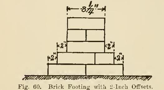 For actual number, or "kiln count," multiply this number by 17, and divide by Footings. These are wide courses placed at the base of a wall to distribute the pressure over a greater area of ground. The usual practice is to make the lowest footing course twice the width of the wall it is to support. Offsets of in. in each superimposed course are then made till the main wallthickness is obtained. Where walls are two or more brick in thickness, the bottom courses of the footings are frequently doubled. The best practice requires the laying of headers in footings as far as possible, and any stretchers used should he laid near the center of the wall. If the soil is soft and compressible, wider footings should be used. Where the loads are extra heavy, it is recommended that each projecting course be made double, with headers on the top course and stretchers at the bottom. The brick used should be the hardest and strongest the market affords; and special care should be given to the jointing, which should be of cement or hydraulic lime.