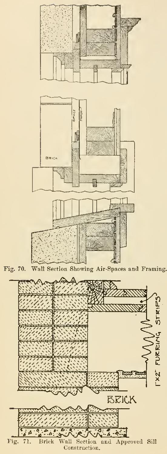 Fig. 70 shows ill sectional detail how this is done. It is a good idea not to crowd the brick close to the sheathing; better set off an inch or the thickness of the blind stop, and make the same wide enough to lap onto the sheathing. However, the building paper should be put on first; and then, after the windowframes are set, it is a good idea to nail a couple of lath an inch or so back of the blind stop, and fill in with mortar, pressing the same in firmly. This can be done at the time the brick are being laid, with practically no loss of time.
