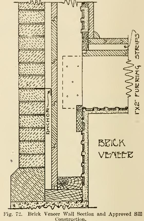 Brick Veneer Wall Construction. In the main, the timber framing to be used with brick veneer construction is identical with the best practice for all-frame houses. A number of points, however, require special attention. The relation of the masonry veneer coat to the studding, and the proper bonding of the masonry and framework., one to the other, is one of these points.