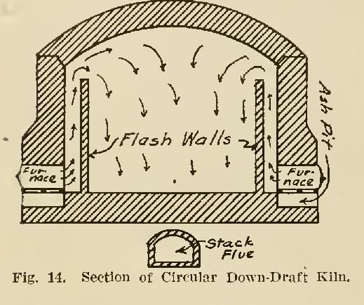 Down-draft kilns are built circular or rectangular, and have permanent walls and roofs. A type of the circular down-draft kiln is shown in the section in the illustration (Fig. 14). As will be noted, the heat is generated in the fire-boxes, and passes into the kiln through the vertical flues or "bags." Striking the roof, the heat is then drawn down through the brick, through openings in the floor, into the stack flue shown beneath the kiln, which leads to the main chimney. In all down-draft kilns, there are many variations in flue and floor construction, but the down-draft principle is the same.