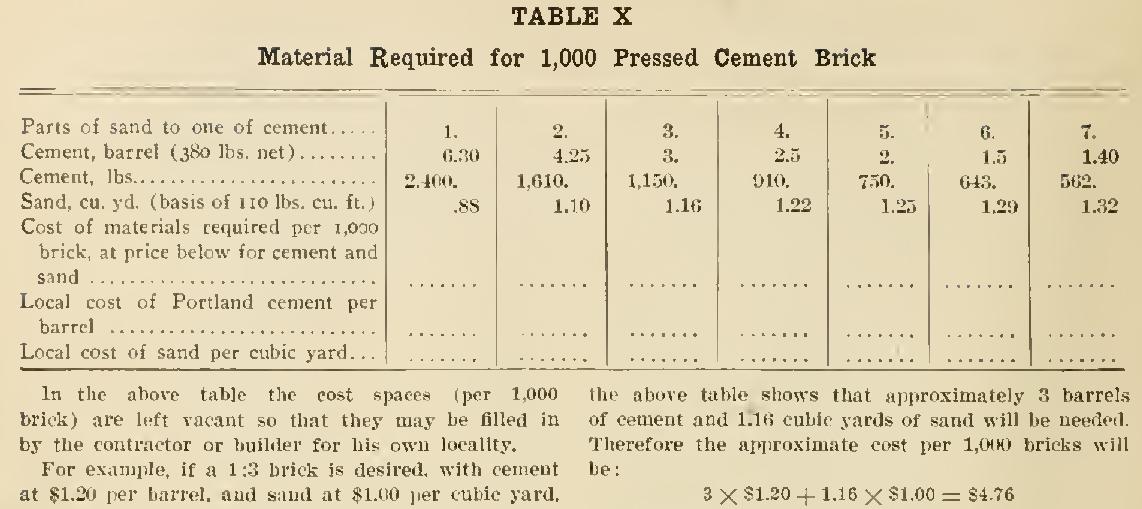Pressed Cement Brick Table X will be found useful in estimating the quantities and cost of materials required for the manufacture of pressed cement brick.