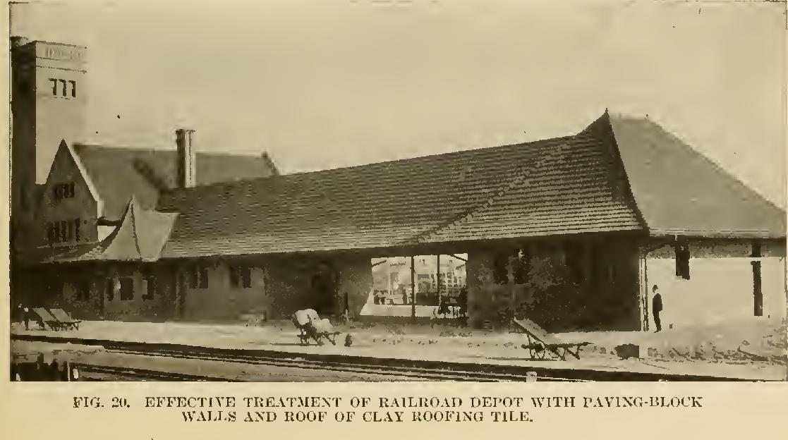 ROOFING TILE The brick house is at its best when' surmounted by a clay tile roof. Roofing tile claim almost as great antiquity as brick, and are found in abundance in oriental ruins. They are imperishable. Their weight insures them from being shaken loose by strong winds, as is often the case with shingles and slate. Their fire-tested body diminishes the fire hazard from adjacent conflagrations. They are impervious to moisture. They can be procured in different colors to harmonize with the wall color scheme, and these colors mellow to greater attractiveness with the passage of years.