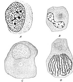 A. From peritoneal epithelium of the salamander-larva. Two centrosomes at the right. Nucleus showing net-knots. [Ft.Esi MING.] B. Spermatogonium of Attraction-sphere (aster) a centrosome. Nucleus with a plasmosonie. [HERMANN.] C. Spinal of Attraction-sphere near the centre, containing a centrosome with several centrioles. [1.ENItossEk.] D. Spermatocyte of Proteus. Nucleus in the spireme-stage. Centrosome attractionsphere rod-shaped bodies. [H ERNtANN.] under certain conditions from one to the other, and that both are to be regarded as specially differentiated areas in that basis.' The terms I The fact that the nucleus may move actively through the cytoplasm, as occurs during the fertilization of the egg and in some other cases, seems to show that the morphological continuity may at times be interrupted.