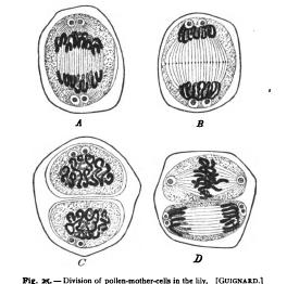 The variations of the chromatic figure must for the most part be considered in the more special parts of this work. There seems to be doubt that a single continuous spireme-thread may be formed (cf. p. 184), but it is equally certain that the thread may appear from the beginning in a number of distinct segments ; i.e. as a segmented spireme. The chromosomes, when fully formed, vary greatly in appearance. In many of the tissues of adult plants and animals A. Anaphase of the first division, showing the twelve daughter-chromosomes on each side, the interzonal fibres stretching between them, and the centrosomes, already double, at the spindlepoles. B. Later stage, showing the cell-plate at the equator of the spindle and the daughterspiremes (dispireme stage of Flemming). C. Division completed ; double centrosomes in the resting cell. D. Ensuing division in progress ; the upper cell at the close of the prophases, the chromosomes and centrosomes still undivided ; lower cell in the late anaphase, cell-plate not yet formed.
