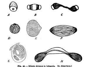 4. Mitosis in the Unicellular Plants and Animals The process of mitosis in the one-celled plants and animals has a peculiar interest, for it is here that we must look for indications of A-C. Macronucleus of Spirochona, showing pole-plates. D-H. Successive stages in the division of the micronucleus of Paramcrcium. D. The earliest stage, showing reticulum. G. Following stage (" sickle-form ") with nucleolus. E. Chromosomes and pole-plates. F. Late ana H. Final phase.