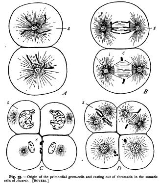 The most beautiful and remarkable known case of early differentiation of the germ-cells is that of Ascaris, where Boveri was able to trace them back continuously through all the cleavage-stages to the two-cell stage! Moreover, from the outset the progenitor of the germcells differs from the somatic cells not only in the greater size and richness of chromatin of its nuclei, but also in its mode of mitosis ; for in all those blastomeres destined to produce somatic cells a portion of the chromatin is cast out into the cytoplasm, where it degenerates, and only in the germ-cells is the sum total of the chromatin retained. In