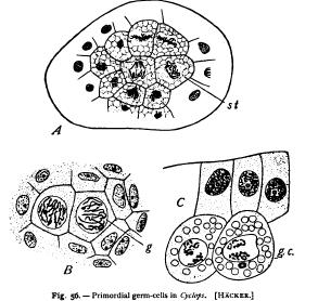 into two and finally gives rise to two symmetrical groups of germcells. Haecker has recently traced very carefully the origin of the primordial germ-cells in Cyclops from a "stem-cell" (Fig. 56) clearly distinguishable from surrounding cells in the early blastula stage, not only by its size, but also by its large nuclei rich in chromatin, and by its peculiar mode of mitosis, as described beyond.