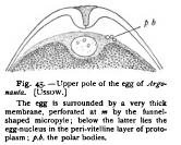 When the egg is surrounded by a membrane before fertilization it is often perforated by one or more openings known as micropyles, through which the spermatozoa make their entrance (Figs. 44, 45). Where there is but one micropyle, it is usually situated very near the upper or anterior pole (fishes, many insects), but it may be at the opposite pole (some insects and mollusks), or even on the side (insects). In many insects there is a group of half a dozen or more micropyles near the upper pole of the egg, and perhaps correlated with this is the fact that several spermatozoa enter the egg, though only one is concerned with the actual process of fertilization.