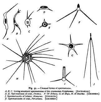 Many interesting details have necessarily been passed over in the foregoing account. One of these is the occurrence, in some birds, amphibia (frog), and mollusks, of two kinds of spermatozoa in the same animal. In the birds and amphibia the spermatozoa are of two sizes, hut of the same form, the larger being known as "giant spermatozoa" (Fig. 49, G, H). In the gasteropod Paludina the two kinds differ entirely in structure, the smaller form being of the usual type and not unlike those of birds, while the larger, or vermiform," spermatozoa have a worm-like shape and hear a tuft of cilia at one end, somewhat like the spermatozoids of plants (Fig. 49, 7. K) In this case only the smaller spermatozoa are functional (von Brunn).