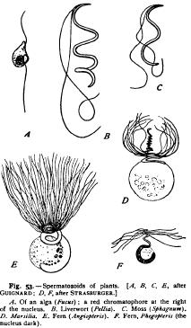 Paternal Germ-cells of Plants In the flowering plants the male germ-cell is represented by a "generative nucleus," together with two centrosomes and a small amount of cytoplasm, lying at the tip of the pollen-tube ( Fig. So, A). On the other hand, in a large number of the lower plants (Pteridophytcs, Muscinew, and many others), the male germ-cell is a minute actively swimming cell, known as the spermatozoid, which is closely analogous to the spermatozoon. The spermatozoids are in general less highly differentiated than spermatozoa, and often show a distinct resemblance to the asexual swarmers or zoospores so common in the lower plants (Figs. 52, 53). They differ in two respects from animal spermatozoa; first in possessing not one but two or several flagella ; second, in the fact that these are attached as a rule not to the end of the cell, but on the side. In the lower forms plastids are present in the form of chromatophores, one of which may be differentiated into a red " eye-spot,' as in Volvox and Fucus(Figs. 41, 53, A), and they may even contain contractile vacuoles (Volvox); but both these structures are wanting in the higher forms. These consist only of a nucleus with a very small amount of cytoplasm, and have typically a spiral form. In Chara, where their structure and development have recently been carefully studied by Belajeff, the spermatozoids have an elongated spiral form with two long flagella attached near the pointed end which is directed forwards in swimming (Fig. 52). The main body of the spermatozoid is occupied by a dense, apparently homogeneous nucleus surrounded by a very delicate layer of cytoplasm. Behind the nucleus, lies a granular mass of cytoplasm, forming one end of the cell, while in front is a slender cytoplasmic tip to which the flagella are attached. Nearly similar spermatozoids occur in the liverworts and mosses. In the ferns and other pteridophytes a somewhat different type occurs (Fig. 53). Here the spermatozoid is twisted into a conical spiral and bears numerous cilia attached along the upper turns of the spire. The nucleus occupies the lower turns, and attached to them is a large spheroidal cytoplasmic mass, which may, however, be cast off when the spermatozoid is set free or at the time it enters the archegonium. This, according to Strasburger, probably corresponds to the basal cytoplasmic mass of Chara. The upper portion of the spire to which the cilia are attached is composed of cytoplasm alone, as in Chara.