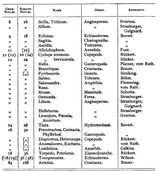1 Indeed, Boveri has found that in Ascaris both modes occur, though the fusion of the germ-nuclei is exceptional. (Cf. p. 216.) 2 The above table is compiled from papers both on fertilization and maturation. Numbers in brackets are inferred.