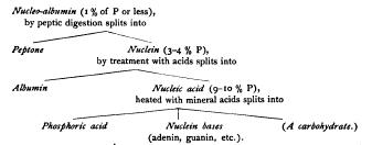 (3) Those with a greater proportion of albumin — a series of substances in which may probably be included pyrenin (nucleoli) and plastin(linin). These graduate into (4) Those containing a minimum (o.5 to i %) of phosphorus the nucleo-albumins, which occur both in the nucleus and in the cytoplasm (vitellin, caseinogin, etc.).